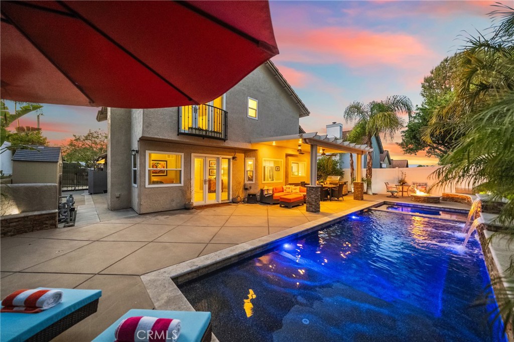 Nestled in the scenic enclave of Sierra Del Oro, adjacent to Yorba Linda, this exquisitely upgraded 4-bedroom residence with a swimming pool offers a seamless blend of comfort and sophistication. Thoughtfully enhanced with modern amenities, this home features dual-pane windows, elegant French doors with a breezeway, a state-of-the-art heating and air conditioning system, and a tankless water heater. Designer touches include 24-inch tile floors, premium carpeting with memory foam underlay, and updated kitchen and bathrooms. Step into the sunlit living and dining areas, where soaring vaulted ceilings, stacked accent windows, and dazzling chandeliers create a warm and inviting ambiance. The diagonally laid tile flooring, framed by 5-inch baseboards, enhances the grandeur of the lower level, while a warm two-tone palette adds a refined touch. The rejuvenated kitchen is a chef's delight, featuring professionally painted cabinetry with upgraded hardware, a stylish full backsplash, stainless steel appliances, a pantry, and a picturesque window showcasing the vibrant backyard and shimmering Pebble-Tech pool. Open to the kitchen, the spacious family room centers around a cozy fireplace--perfect for gatherings. A versatile downstairs bedroom and full bathroom provide flexibility to suit any lifestyle. Outside, your private backyard oasis awaits--an entertainer's paradise designed for year-round enjoyment. The Rock veneer-accented Pebble-Tech pool, complete with a Baha shelf, oversized spa, and three sheer descent waterfalls, sets the stage for endless relaxation. Resort-style amenities include a built-in BBQ, a high-ceiling covered patio with cooling ceiling fans, a fire pit with wrap-around seating, Malibu-style lighting, and lush landscaping bursting with vibrant blooms. Vinyl fencing ensures privacy, while a side-access gate accommodates recreational vehicles. Upstairs, the grand primary suite is a tranquil retreat, highlighted by vaulted ceilings, a walk-in closet, and luxe French doors leading to a charming Juliette balcony with serene backyard views. Additional perks include a two-car garage with a smart opener, built-in cabinetry, and ample storage. Ideally located just moments from a neighborhood park with a splash zone, shopping, and a California Distinguished School, this home offers the ultimate blend of luxury, convenience, and freedom--with no HOA or Mello Roos. Experience the best of Southern California living--welcome home!
